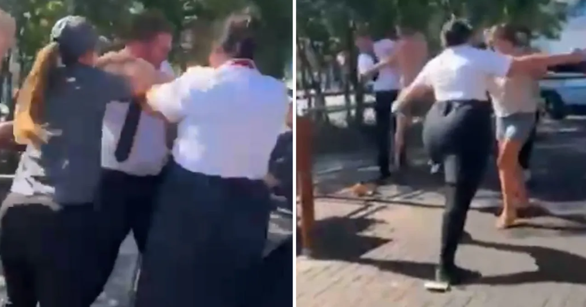 Footage of the incident shows around a dozen people involved in chaotic clashes on the pavement. One shirtless man is heard being told to “get off me” by a McDonald’s worker, while a woman in a skirt appears to slap another man, sending him to the ground.