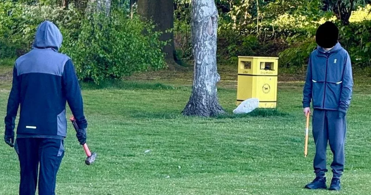 Photos from the scene show groups of youths — some on bikes — gathering on the pitch before violence flared. In one shocking image, a youth can be seen wielding a large hammer, while another clutches what appears to be a cricket stump.